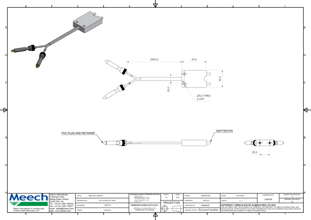 Meech’s model 976 Ion Head is a small, lightweight ioniser, designed for use with the Meech PulseDrive Lite and PulseDrive Plus PDC Controllers.